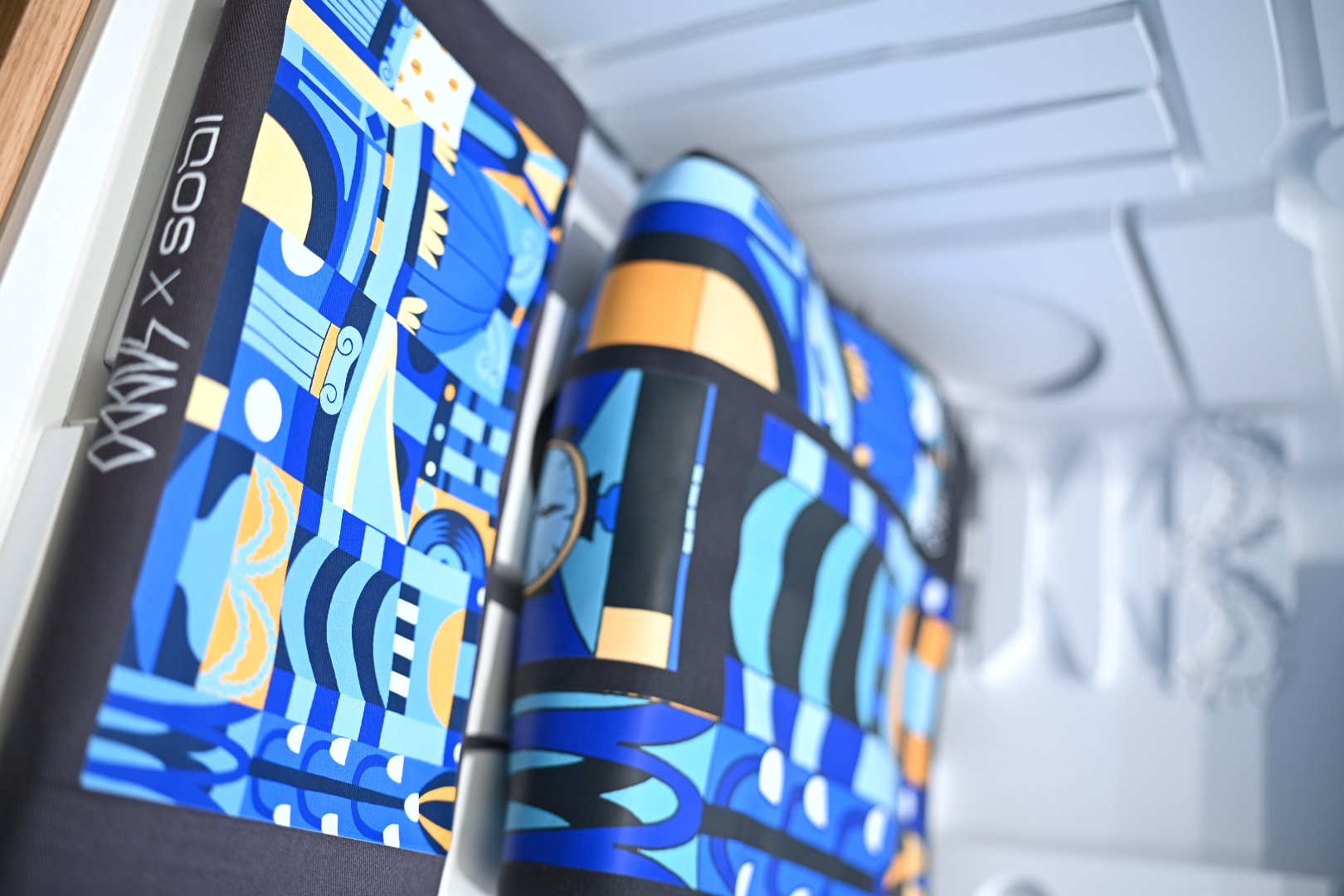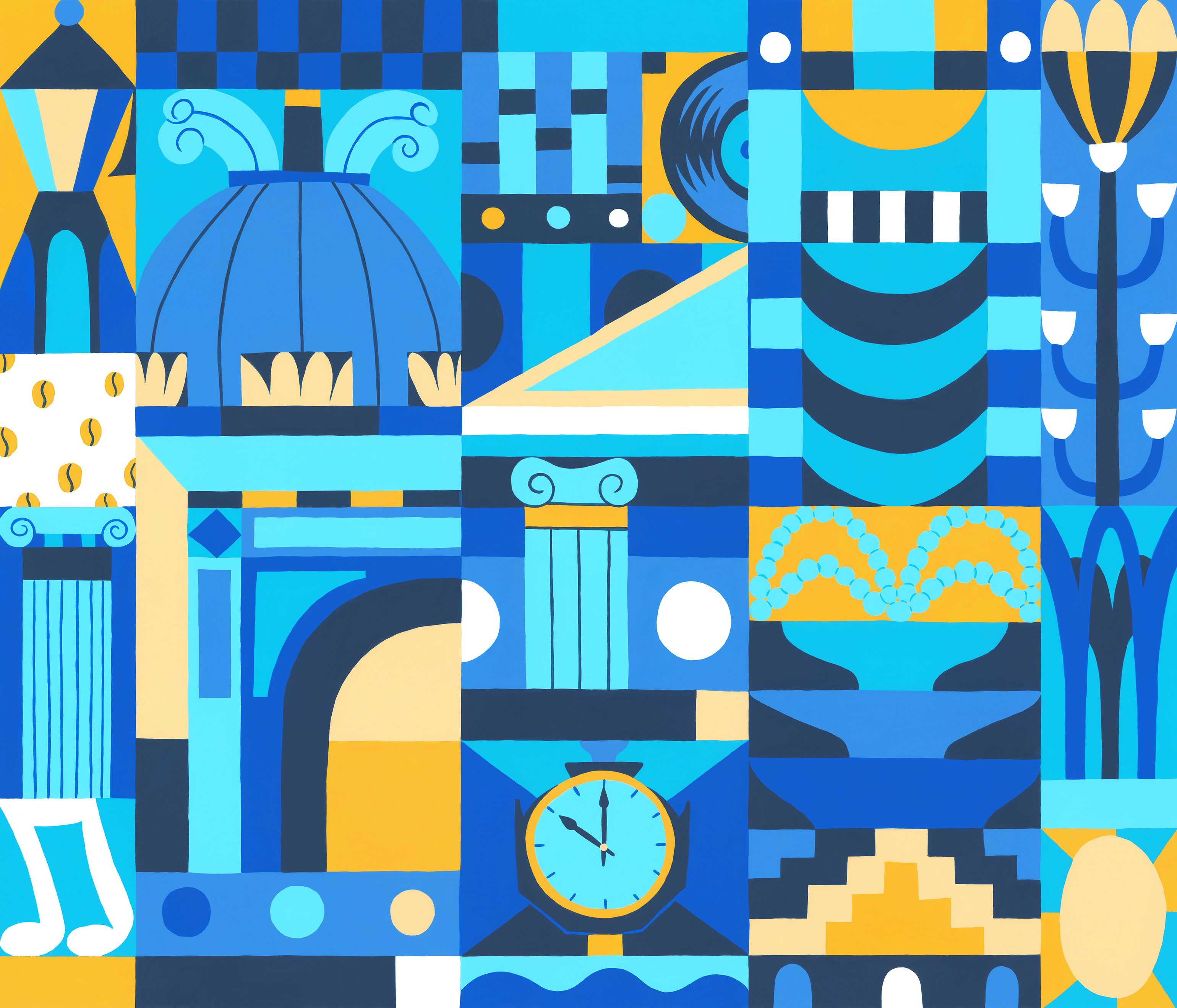 My illustration is a collage of iconic Bucharest landmarks, architectural details, nods to the specialty coffee and the electronic music scenes, everything treated in an almost abstract way. I love how the Godmother team translated my shapes in different mediums and formats, from print to three dimensional objects and animation.