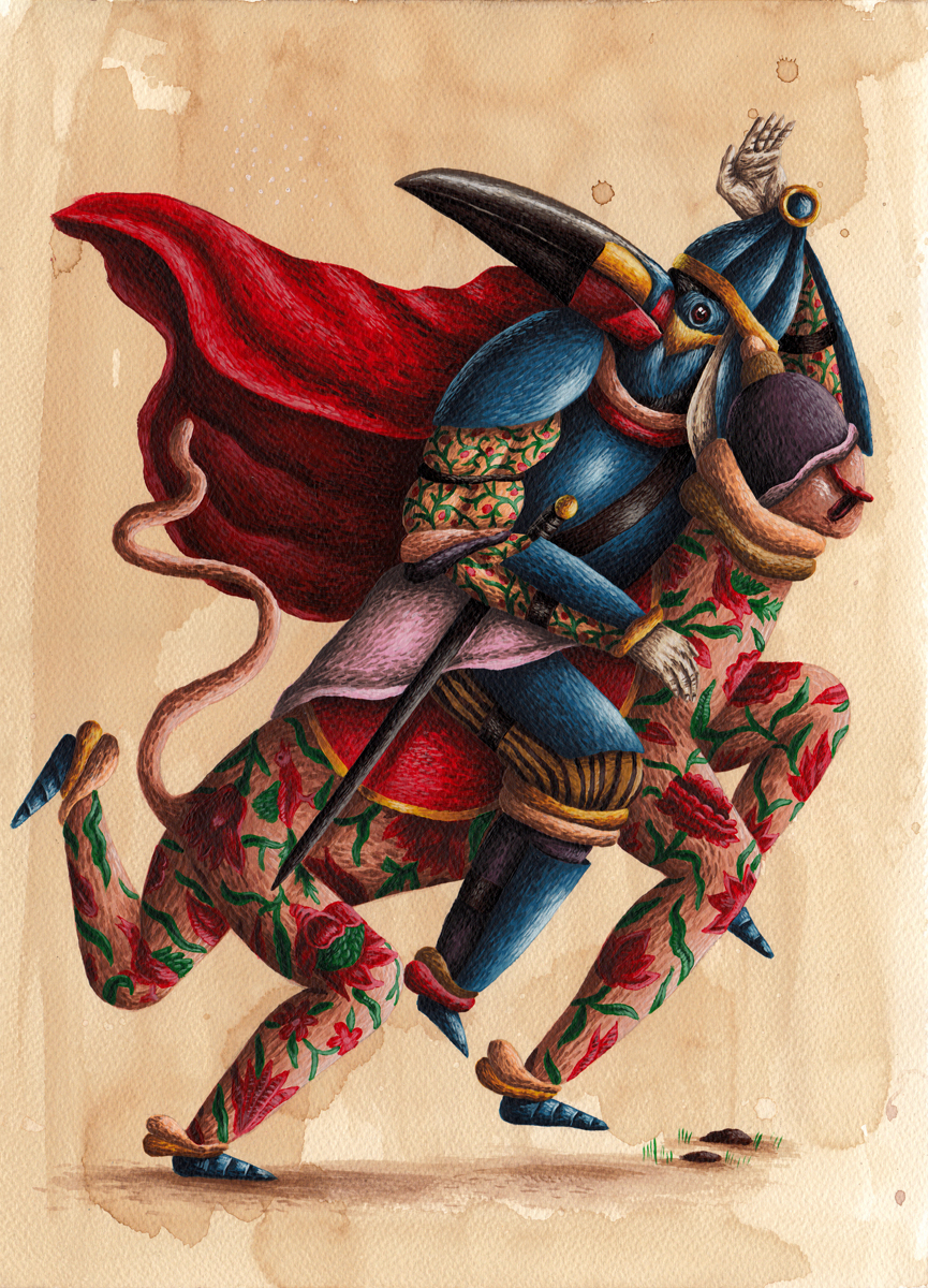 The series brings a twist to the self-centered portraits of conquerors, replacing the human face with bird heads, and it depicts a fantastic world of the future, in which humans have slowly devolved into savages or even wild animals, and the world is ruled by a race of super-birds, who are conquering the last human groups. Thus the human history of conquests and extinction of other human communities and entire species of animals, repeats itself but finds human race in the opposite role, that of a species which is hunted and almost extinct. The illustrations come from a fascination for myths, eerie folk stories, fantastic scenarios, but can also be viewed as an invitation to modesty and more respect for nature and all the earthlings.