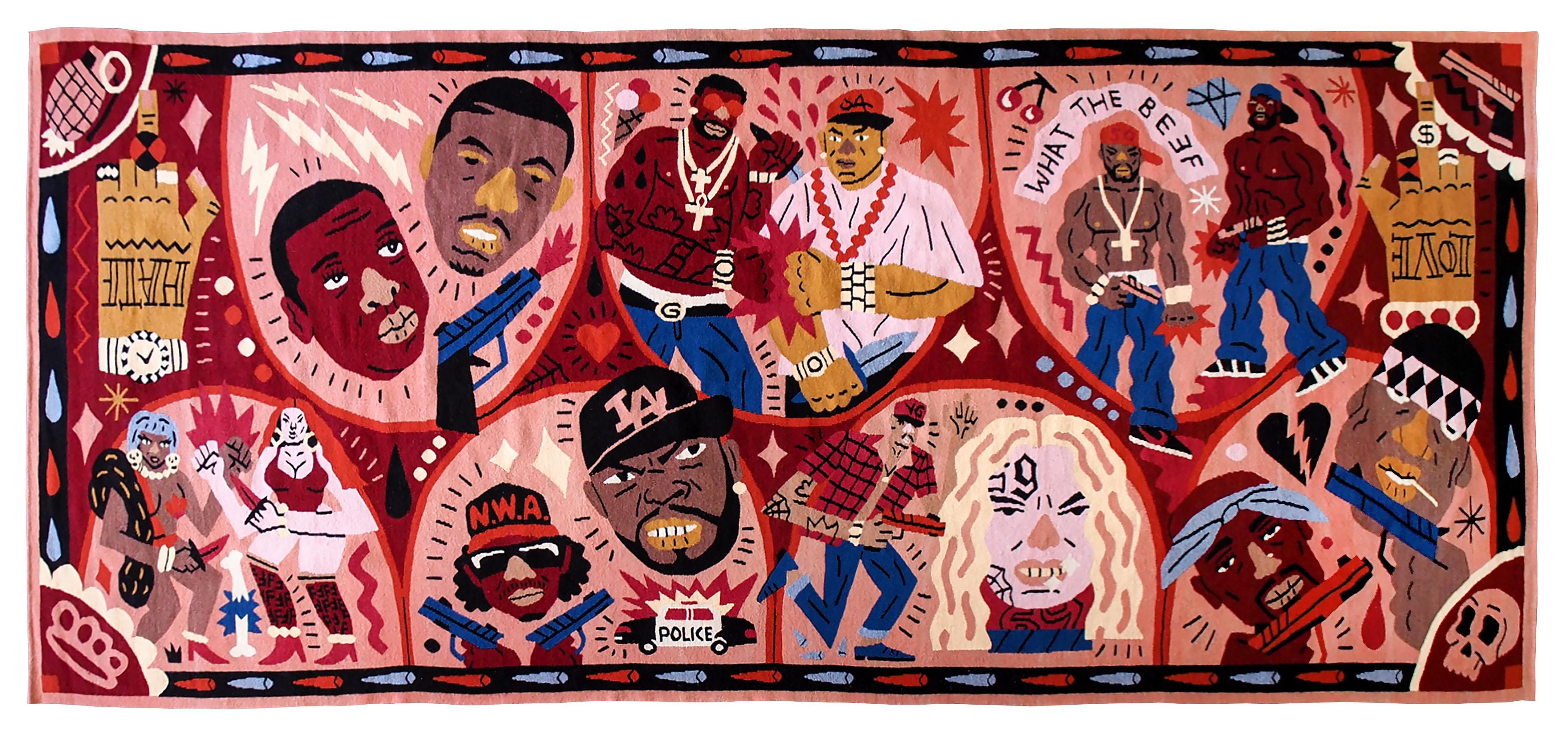 The piece is inspired by different beefs in hip-hop: Lil Kim vs Nicki Minaj, Jay-Z vs Nas, NWA vs Ice Cube, Gucci Mane vs Young Jeezy, YG vs 6ix9ine, 50 Cent vs The Game, Biggie vs Tupac.